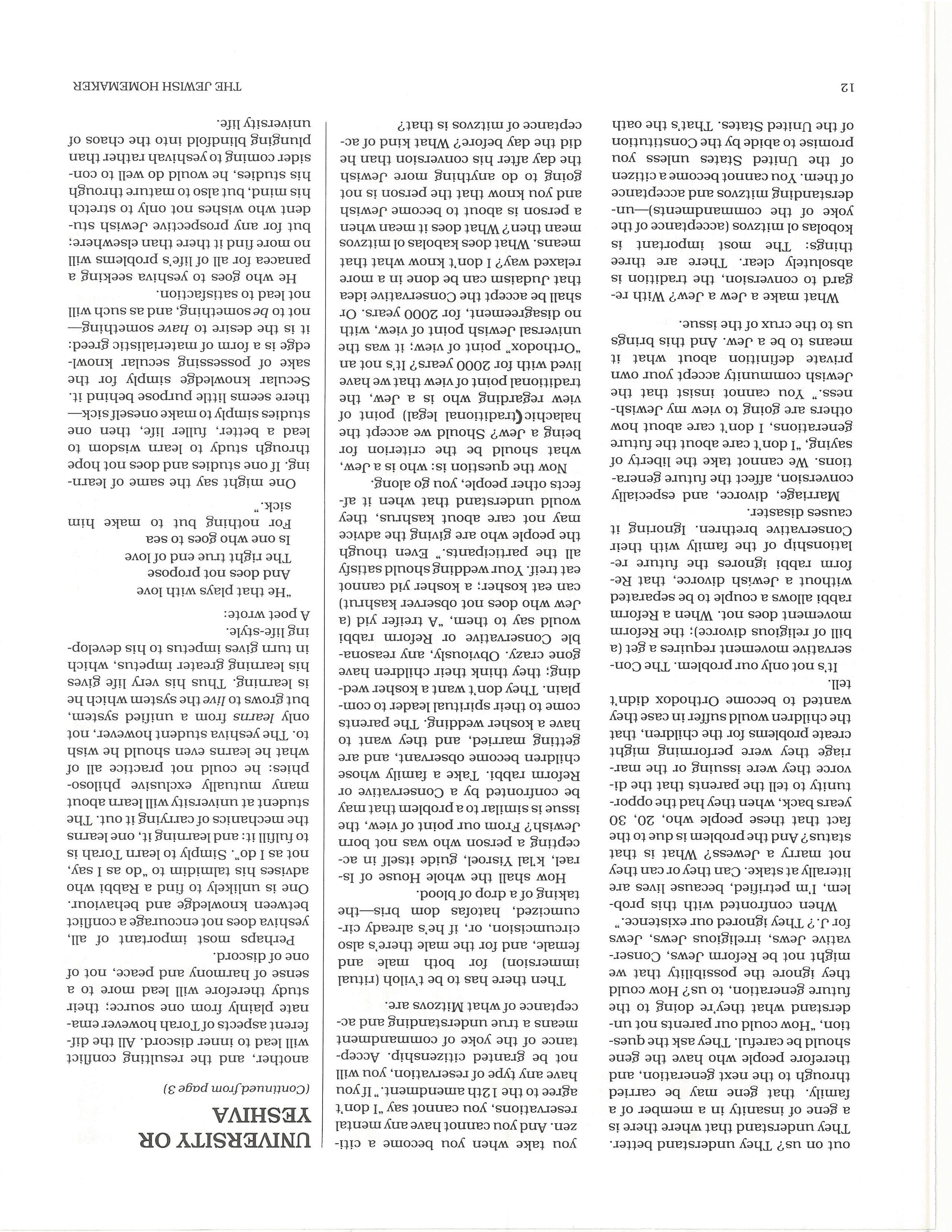 Western society seems convinced ofthe value ofa secular degree from a secular university, and yeshiva is seen by many Jews as perhaps an al ternative to post-graduate studies, or merely a way of filling a long sum mer vacation—an alternative to being a playboy on the Riviera for three months. Yet yeshiva should be seen not merelyas an alternative, but actually as preferable to a course at a secular university.
