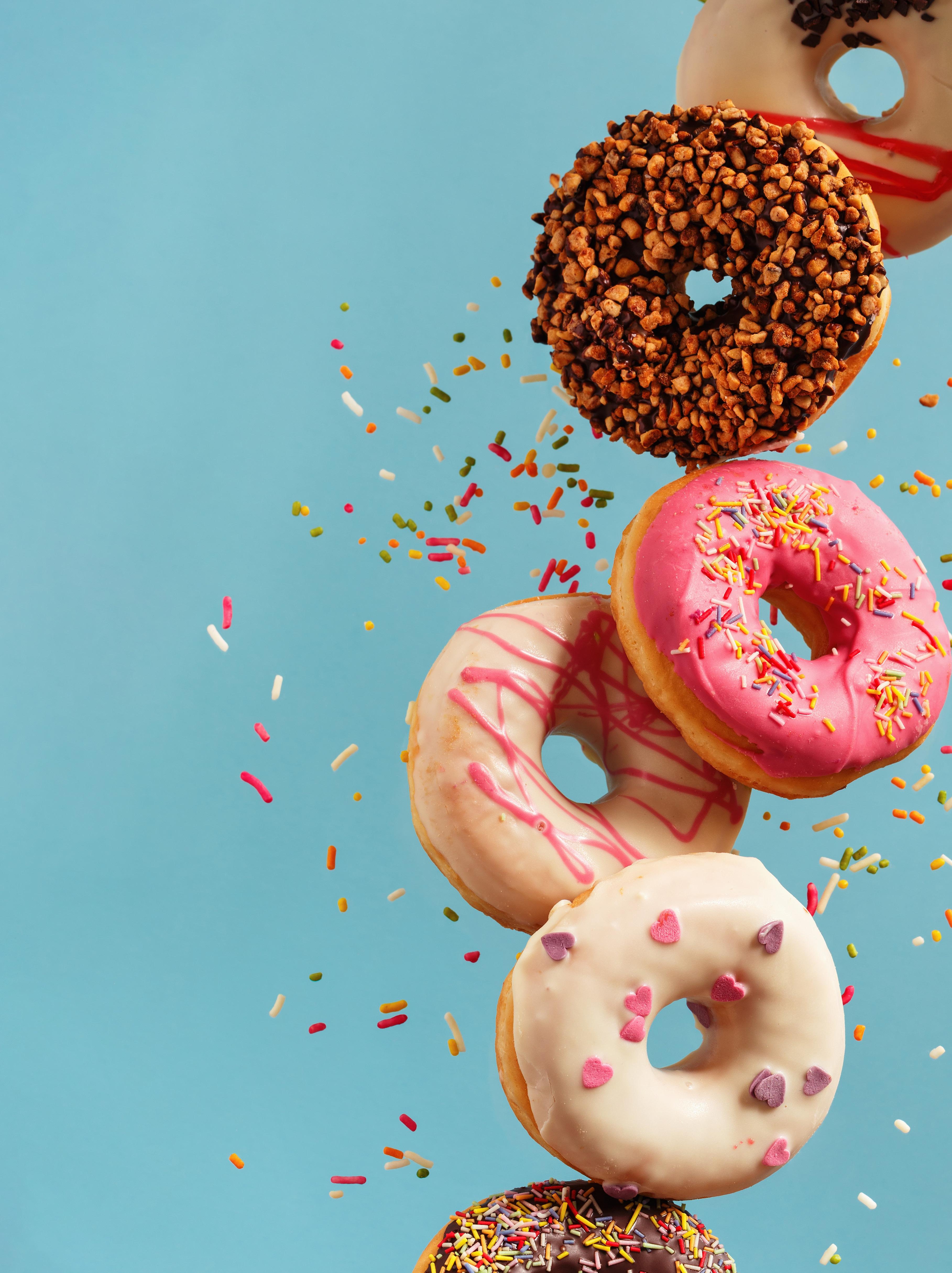 The halacha is1 that the main ingredient defines the brocha, even when other ingredients are mixed in. Flour made from one of the five grains (wheat, spelt, barley, oats and rye) is always considered the main ingredient, even when the amount is very small, as long as it is an integral part of the final product. If the flour is only added as a binder or color it is not considered the main ingredient. Usually, when one eats a large amount of a baked product one should say the brocha hamotzi, but a conventional donut is deep fried in oil, which is considered cooking and not baking. Therefore, the brocha is always mezonos and the after brocha is al hamichya. If you are eating baked doughnuts in a large quantity, a Rav should be consulted.