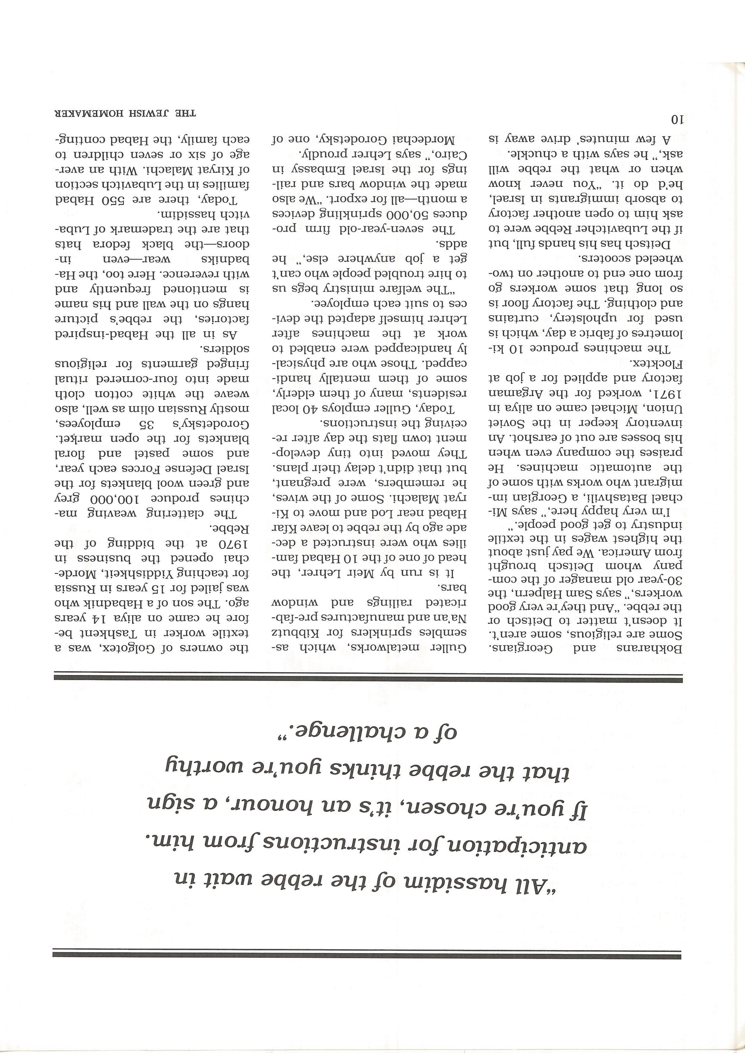 A visit to the Chabad community of Kiryat Malachi by the Jerusalem Post staffer who learns what has happened in the development town in the ten years since the hassidim arrived there. A page-and-three-column spread in the Post.