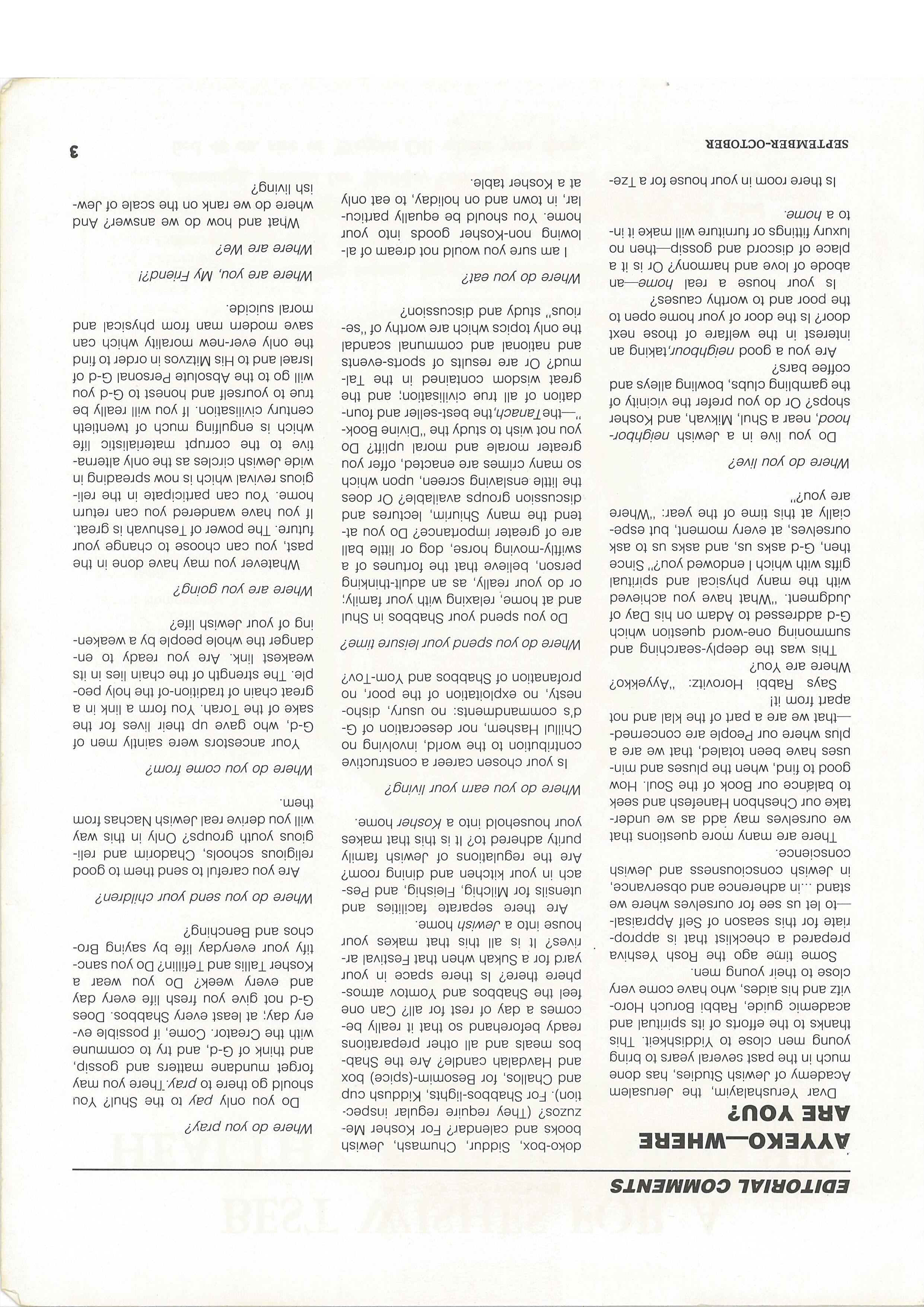 Do you spend your Shabbos in Shul and at home, relaxing with your family; or do your really, as an adult-thinking person, believe that the fortunes of a swiftly-moving horse, dog or little ball are of greater importance? Do you at tend the many Shiurim, lectures and discussion groups available? Or does the little enslaving screen, upon which so many crimes are enacted, offer you greater morale and moral uplift? Do you not wish to study the “Divine BooktheTanach,the best-seller and foun dation of all true civilisation; and the great wisdom contained in the Tal mud? Or are results of sports-events and national and communal scandal the only topics which are worthy of “se rious” study and discussion?