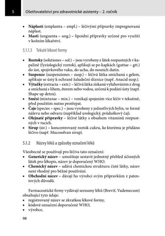 Všeobecně se používají pro léčiva tato označení: ■ Generický název – umožňuje sestavit jednotný přehled účinných látek pro lékopis, název je doporučený WHO. ■ Chemický název – udává chemickou strukturu čisté látky, název není vhodný pro běžné používání. ■ Obchodní název – dávají ho výrobci svým přípravkům z patentových důvodů. Farmaceutické firmy vydávají seznamy léků (Brevíř, Vademecum) obsahující tyto údaje: ■ registrovaný název se zkratkou lékové formy, ■ kódové označení doporučené WHO, ■ výrobce, 98