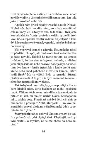 uvařili něco teplého, zatímco na druhém konci údolí zavlály vlajky a všichni si chodili sem a tam, jen tak, jako o dovolené nebo tak. A pak k nám přišel nějaký trpaslík a řekl: ‚Neuvěřitelná věc, hoši, uvidíte něco, co nikdo neviděl už celé miliony let,‘ a taky že ano, to ti řeknu. Byli jsme kus od začátku fronty, protože mezitím vytvořili trollové, lidé a trpaslíci frontu vedoucí do jeskyně a každý, kdo se z jeskyně vracel, vypadal, jako by byl zhypnotizovaný. Víš, vyprávěl jsem ti o zázraku Koumského údolí už předtím, chlapče, ale tenhle obrázek mě a Placáka jsi ještě neviděl. Udělali ho těsně po tom, co jsme si uvědomili, že ten den se bojovat nebude, a všichni jsme šli po jednom nebo po dvou do té jeskyně a viděli tam dva krále – krále trpaslíků a krále trollů uzavřené nebo snad pohřbené v zářícím kameni, kteří hráli Buch! My to viděli! Byla to pravda! Zůstali přáteli ve smrti. A to pro nás bylo znamení, že nemusíme být nepřáteli ani v životě. Tak to bylo až do chvíle, kdy jsme později s Placákem hledali něco, čeho bychom se mohli společně napít. Většina těch kolem nás dělala to samé, ale to pití, co mi dal, mi málem utrhlo hlavu. Každopádně mi to ožehlo boty. Placák už má dvě děti, víš, daří se mu dobře a pracuje v Ankh-Morporku. Trollové nejsou žádní psavci, ale já na něj a Koumské údolí vzpomínám každý den.“ Starý příštipkář se podíval úkosem synovi do tváře a pokračoval: „Jsi chytrý kluk. Chytřejší, než byl tvůj bratr… a myslím, že se mě chceš na něco zeptat.“ 98