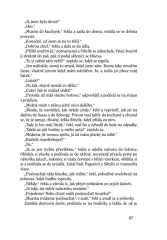 „Já jsem byla divná?“ „Hm.“ „Musím do kuchyně,“ řekla a zašla do domu, vrátila se se dvěma porcemi. „Konečně, už jsem se na to těšil.“ „Dobrou chuť,“ řekla a dala se do jídla. „Příště uvařím já,“ poznamenal a Sibylle se zakuckala. Vstal, bouchl ji dvakrát do zad, pak jí podal sklenici se šťávou. „Ty si vážně sám vaříš?“ zeptala se, když se napila. „Jen málokdy, nemá to smysl, když jsem sám. Doma taky nevařím často, vlastně jenom když mám návštěvu. Jo, a našla jsi přece můj lístek.“ „Lístek?“ „No tak, stejně nemáš co dělat.“ „Cože? Jak to můžeš vědět?“ „Protože už máš všecko hotovo,“ odpověděl a podíval se na stojan s prádlem. „Možná mám v plánu ještě něco dalšího.“ „Škoda, že nemůžeš, tak někdy jindy,“ řekl a vyprávěl, jak jel na skútru do Sassa a do Seborgy. Potom vzal talíře do kuchyně a chystal se, že je umyje. Hodný, řekla Sibylle, když přišla za ním. „Tady je ten můj lístek,“ řekl, vzal ho a vyhodil do koše na odpadky. „Takže za půl hodiny u mého auta?“ zeptala se. „Můžeme jít rovnou spolu, já už mám plavky na sobě.“ „Ručník nepotřebuješ?“ „Ne.“ „Já se jen rychle převléknu,“ řekla a odešla nahoru do ložnice. Oblékla si plavky a podívala se do skříně, nervózně přejela prsty po několika šatech, nakonec si vzala červené s bílým vzorkem, oblékla si je a podívala se do zrcadla. Začal hrát Paganini a Sibylle si rozpustila vlasy. „Posloucháš ráda klasiku, jak vidím,“ řekl, pohodlně uvelebený na pohovce, když hudbu vypnula. „Někdy,“ řekla a všimla si, jak přejel pohledem po jejích šatech. „Já taky, ale tuhle nahrávku neznám.“ „Pojedeme? Nebo chceš radši poslouchat muziku?“ „Muziku můžeme poslouchat i v autě,“ řekl a zvedl se z pohovky. Zamkla domovní dveře, podívala se na hodinky a řekla, že už je