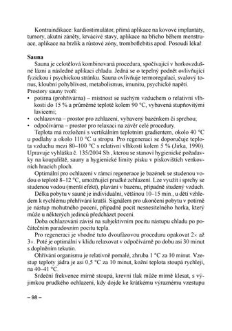 Kontraindikace: kardiostimulátor, přímá aplikace na kovové implantáty, tumory, akutní záněty, krvácivé stavy, aplikace na břicho během menstruace, aplikace na brzlík a růstové zóny, tromboflebitis apod. Posoudí lékař. Sauna Sauna je celotělová kombinovaná procedura, spočívající v horkovzdušné lázni a následné aplikaci chladu. Jedná se o tepelný podnět ovlivňující fyzickou i psychickou stránku. Sauna ovlivňuje termoregulaci, svalový tonus, kloubní pohyblivost, metabolismus, imunitu, psychické napětí. Prostory sauny tvoří: • potírna (prohřívárna) – místnost se suchým vzduchem o relativní vlhkosti do 15 % a průměrné teplotě kolem 90 °C, vybavená stupňovitými lavicemi; • ochlazovna – prostor pro zchlazení, vybavený bazénkem či sprchou; • odpočívárna – prostor pro relaxaci na závěr celé procedury. Teplota má rozložení s vertikálním teplotním gradientem, okolo 40 °C u podlahy a okolo 110 °C u stropu. Pro regeneraci se doporučuje teplota vzduchu mezi 80–100 °C s relativní vlhkostí kolem 5 % (Jirka, 1990). Upravuje vyhláška č. 135/2004 Sb., kterou se stanoví hygienické požadavky na koupaliště, sauny a hygienické limity písku v pískovištích venkovních hracích ploch. Optimální pro ochlazení v rámci regenerace je bazének se studenou vodou o teplotě 8–12 °C, umožňující prudké zchlazení. Lze využít i sprchy se studenou vodou (menší efekt), plavání v bazénu, případně studený vzduch. Délka pobytu v sauně je individuální, většinou 10–15 min., u dětí vzhledem k rychlému přehřívání kratší. Signálem pro ukončení pobytu v potírně je nástup mohutného pocení, případně pocit nesnesitelného horka, který může u některých jedinců předcházet pocení. Doba ochlazování závisí na subjektivním pocitu nástupu chladu po počátečním paradoxním pocitu tepla. Pro regeneraci je vhodné tuto dvoufázovou proceduru opakovat 2× až 3×. Poté je optimální v klidu relaxovat v odpočívárně po dobu asi 30 minut s doplněním tekutin. Ohřívání organismu je relativně pomalé, zhruba 1 °C za 10 minut. Vzestup teploty jádra je asi 0,5 °C za 10 minut, kožní teplota stoupá rychleji, na 40–41 °C. Srdeční frekvence mírně stoupá, krevní tlak může mírně klesat, s výjimkou prudkého ochlazení, kdy dojde ke krátkému výraznému vzestupu – 98 –