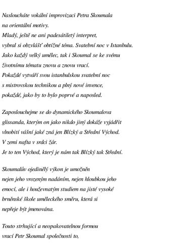 Nasloucháte vokální improvizaci Petra Skoumala na orientální motivy. Mladý, ještě ne ani padesátiletý interpret, vybral si obzvlášť obtížné téma. Svatební noc v Istanbulu. Jako každý velký umělec, tak i Skoumal se ke svému životnímu tématu znovu a znovu vrací. Pokaždé vytváří svou istanbulskou svatební noc s mistrovskou technikou a plný nové invence, pokaždé, jako by to bylo poprvé a naposled. Zaposlouchejme se do dynamického Skoumalova glissanda, kterým on jako nikdo jiný dokáže vyjádřit vlnobití vášní jaké zná jen Blízký a Střední Východ. V zemi nafta v srdci žár. Je to ten Východ, který je nám tak Blízký tak Střední. Skoumalův ojedinělý výkon je umožněn nejen jeho vrozeným nadáním, nejen hloubkou jeho emocí, ale i houževnatým studiem na jisté vysoké brněnské škole uměleckého směru, která si nepřeje být jmenována. Touto strhující a neopakovatelnou formou vrací Petr Skoumal společnosti to, Ukázka elektronické knihy, UID: KOS208516