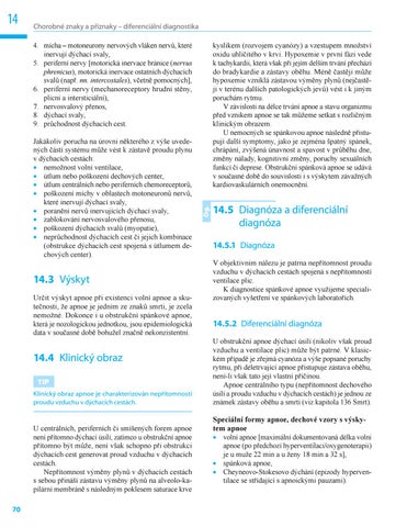 14.5 Diagnóza a diferenciální diagnóza 14.5.1 Diagnóza V objektivním nálezu je patrna nepřítomnost proudu vzduchu v dýchacích cestách spojená s nepřítomností ventilace plic. K diagnostice spánkové apnoe využijeme specializovaných vyšetření ve spánkových laboratořích.