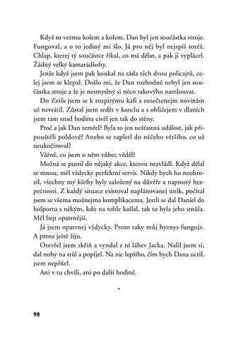 Když to vezmu kolem a kolem, Dan byl jen součástka stroje. Fungoval, a o to jediný mi šlo. Já pro něj byl nejspíš totéž. Chlap, kterej tý součástce říkal, co má dělat, a pak ji vyplácel. Žádný velký kamarádšofty. Jenže když jsem pak koukal na záda těch dvou policajtů, celej jsem se klepal. Došlo mi, že Dan rozhodně nebyl jen součástka stroje a že je nesmyslný si něco takovýho namlouvat. Do Exilu jsem se k rozpitýmu kafi a rozečtenejm novinám už nevrátil. Zůstal jsem sedět v kanclu a s obličejem v dlaních jsem tam snad hodinu civěl jen tak do stěny. Proč a jak Dan zemřel? Byla to jen nešťastná událost, jak připouštěli poldové? Anebo se zapletl do něčeho většího, co už neukočíroval? Vážně, co jsem o něm vůbec věděl? Možná se pustil do nějaký akce, kterou nezvládl. Když dělal se mnou, měl vždycky perfektní servis. Nikdy bych ho neohrozil, všechny mý kšefty byly založený na důvěře a naprostý bezpečnosti. Z každý situace existoval naplánovanej únik, počítal jsem se všema možnejma komplikacema. Jestli se dal Daniel do holportu s někým, kdo na tohle kašlal, tak to byla jeho smůla. Měl bejt opatrnější. Já jsem opatrnej vždycky. Proto taky můj byznys funguje. A proto ještě žiju. Otevřel jsem skříň a vyndal z ní láhev Jacka. Nalil jsem si, dal nohy na stůl a popíjel. Na nic lepšího, čím bych Dana uctil, jsem nepřišel. Ani v tu chvíli, ani po další hodině. *