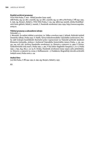 Použité archivní prameny: VÚA-VHA Praha, f. 1616 – Boháč Jaroslav (1919–1936). ABS Praha, sig. 141-186-1; tamtéž, sig. 141-188-1; tamtéž, sig. 141-188-9; NA Praha, f. PŘ 1941–1951, k. 696, sig. B2256/1, Boháč J.; VÚA–VHA Praha, f. 255, sig. 38877/49; tamtéž, sbírka Kvalifikačních listin gážistů, Boháč J.; tamtéž, f. Památník osvobození 1919–1939; http://www.vuapraha. army.cz. Tištěné prameny a sekundární zdroje: Dolenský 1, 2. J. Werstadt, Za našimi oběťmi a mrtvými, in: Válka a revoluce 1947; J. Jelínek, Politické ústředí domácího odboje, Praha 1947; V. Fejlek, Vývoj československého vojenského archivnictví, Praha 1968 (rukopis kandidátské disertační práce vypracované na Vojenské politické akademii Klementa Gottwalda, uloženo v knihovně Vojenského historického ústavu Praha, s. 136, 142, 143, 144, 157); týž, Archivy Památníku osvobození, in: Historie a vojenství 17, 1969; P. Drtina, Československo můj osud I, Praha 1991, s. 465; V boj (edice ilegálního časopisu), I, sv. 6, Praha 1992, s. 842, 844, 863; s. 32–33; K. Straka, Památník osvobození (1929–1939) a jeho předchůdci, in: Historie a vojenství 57, 2009; J. Hoffmannová – J. Pražáková, Biografický slovník archivářů českých zemí, Praha 2000, s. 94. Osobní foto: (10) NA Praha, f. PŘ 1941–1951, k. 696, sig. B2256/1, Boháč J.; 1937. KS
