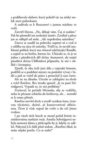 a poděkovala sluhovi, který položil tác na nízký stolek mezi pohovkami. A zadívala se k Roscoeovi s jasnou otázkou ve tváři. Zavrtěl hlavou. „Ne, děkuji vám. Čaj si nedám.“ Pak ho přemohl ten rozkošný úsměv. Zaváhal a přece jen se odlepil od stolu. „Ale nepohrdnu sušenkou.“ Znovu se usadil na pohovku naproti ní a vzal si z talířku na tácu tři sušenky. Tvářil se, že nevidí souhlasný pohled, který mu věnoval odcházející Rundle, a zeptal se na knihu, kterou čte. Ukázalo se, že je to jedno z působivých děl slečny Austenové, ale stejně působivá slečna Cliffordová připustila, že má v oblibě i životopisy. Zjistili, že oba četli jistá díla z vojenské historie, podělili se o podobné názory na poslední vývoj v Indii a pak se vrátil do práce a ponechal ji zase čtení. Ale ne na dlouho. Ozvalo se zaklepání na dveře a vešel Rawlins. Bez úvodu spustil: „Je tu paní Selwidgeová. Vypadá to, že má problémy.“ Zvažoval, že požádá Mirandu, aby se vzdálila, nebo že přesune schůzku do knihovny, ale… nemohl se k tomu přimět. Rawlins otevřel dveře a uvedl vysokou ženu, čerstvou třicátnici, slušně, až konzervativně oblečenou. Život jí však vepsal do tváře a do očí jistou tvrdost. I po všech těch letech se musel pořád bránit instinktivnímu nutkání vstát. Amelia Selwidgeová nebyla urozená dáma a překvapilo by ji, kdyby to udělal. Pokynul jí k židli před stolem. „Rawlins říkal, že máte nějaké potíže. Co se stalo?“ 98 Ukázka elektronické knihy, UID: KOS278873