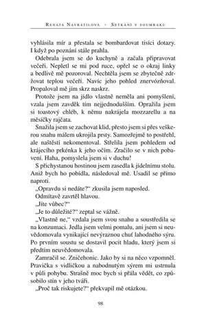 vyhlásila mír a přestala se bombardovat tisíci dotazy. I když po poznání stále prahla. Odebrala jsem se do kuchyně a začala připravovat večeři. Nepletl se mi pod ruce, opřel se o okraj linky a bedlivě mě pozoroval. Nechtěla jsem se zbytečně zdržovat teplou večeří. Navíc jeho pohled znervózňoval. Propaloval mě jím skrz naskrz. Protože jsem na jídlo vlastně neměla ani pomyšlení, vzala jsem zavděk tím nejjednodušším. Opražila jsem si toastový chléb, k němu nakrájela mozzarellu a na měsíčky rajčata. Snažila jsem se zachovat klid, přesto jsem si přes veškerou snahu málem ukrojila prsty. Samozřejmě to postřehl, ale naštěstí nekomentoval. Střelila jsem pohledem od krájecího prkénka k jeho očím. Zračilo se v nich pobavení. Haha, pomyslela jsem si v duchu! S přichystanou hostinou jsem zasedla k jídelnímu stolu. Aniž bych ho pobídla, následoval mě. Usadil se přímo naproti. „Opravdu si nedáte?“ zkusila jsem naposled. Odmítavě zavrtěl hlavou. „Jíte vůbec?“ „Je to důležité?“ zeptal se vážně. „Vlastně ne,“ vzdala jsem svou snahu a soustředila se na konzumaci. Jedla jsem velmi pomalu, ani jsem si neuvědomovala vynikající nevýraznou chuť lahodného sýru. Po prvním soustu se dostavil pocit hladu, který jsem si předtím neuvědomovala. Zamračil se. Zničehonic. Jako by si na něco vzpomněl. Pravička s vidličkou a nabodnutým sýrem mi ustrnula v půli pohybu. Strašně moc bych si přála vědět, co způsobilo stín v jeho tváři. „Proč tak riskujete?“ překvapil mě otázkou. 98