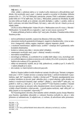 Adj starý j. A. (Muž, někdy s odstínem údivu a ve vztahu k jeho zkušenosti a filozofickému nadhledu:) být neobvykle starý, popř. i zkušený, moudrý a rozvážný. ♦ Abrahám, biblická postava (Gn 11 – 25), byl hebrejský patriarcha, praotec Židů a zakladatel judaismu; podle bible žil 175 let. ■ S starý, být starý j. Metuzalém, pamatovat Abraháma A ještě mu teče mlíko po bradě, je to zelenáč, má ještě skořápku v zadku / u prdele, může se holit v průvanu, mít telecí léta Cf starý, být starý j. sám svět, být už v letech, je mu už nějaký pátek. (А) be as old as Methuselah / Adam (N) alt w. Methusalem sein (F) vieux c. Hérode / Methusalem / le monde (R) он стар(ый) к. мир! из него песок сыплетcя.406 V našem příkladu je heslové záhlaví být° starý jako Abrahám. Charakteristika tohoto frazému je tato: – stylová příslušnost neutrální, expresivita důrazná a frekvence řídká; – omezenost možných gramatických kategorií; negativní charakteristiky, výraz se neužívá v kategoriích: otázka, negace, imperativ, záporný imperativ, plurál; – s možností transformace: adjektivizace; symbol ° označuje slovo gramaticky nebo lexikálně obměnitelné; – kontext a valence jsou dány v závorce před výkladem; – znamenající neobvykle starý, popř. i zkušený, moudrý a rozvážný; – neuvedena exemplifikace; – etymologie je biblická, za symbolem ♦ se uvádějí další údaje o úzu, etymologii atd. – za symbolem ■ jsou uvedena synonyma a ekvivalenty (S) a širší synonymie, nepřímá funkční ekvivalence (Cf) a opozita (A) – odkaz na sémantický rejstřík, ten je vždy jednoslovný, uváděn je po S, A nebo Cf, v našem případě je to starý; – ekvivalenty ve všech čtyřech světových jazycích. Heslový frazém (záhlaví) může obsahovat varianty dvojího typu. Varianty syntagmatické jsou v SČFI v kulaté závorce a označují část hesla v určitých kontextech vypustitelnou, např. být° (opuštěný) j. hruška v (širém) poli.407 Varianty paradigmatické jsou uvedeny lomítkem za slovem, popř. několika slovy, s nimiž alternují, nebo zkratkou n. (nebo) u víceslovných frazémů, např. naříkat° / fňukat° j. stará bába408 nebo jde j. na pohřeb n. tváří se j. když jde / j. by šel na pohřeb.409 Část frazému uváděná v hranaté závorce upozorňuje na závazný nebo charakteristický slovní kontext hesla, který je – zvláště u hesel formální a větné povahy – k jejich popisu nezbytný, např. dělej jak / co dělej [stejně se ti to nepodaří / nepovede].410 Ve Frazeologickém slovníku chorvatského neboli srbského jazyka Josipa Matešiće jsou frazémy uspořádány abecedně a o zařazení frazému rozhodlo to, zda je v něm přítomno a) substantivum, b) adjektivum, c) verbum, d) adverbium nebo pronomen. 406 Ibid., s. 33. 407 Ibid., s. 127. 408 Ibid., s. 38. 409 Ibid., s. 279. Toto je příklad běžného hesla odkazového; odkázáno je na heslo jít j. na funus. 410 Ibid., s. 83.