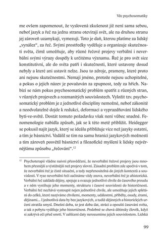 me ovšem zapomenout, že vyslovená zkušenost již není sama sebou, neboť jazyk a řeč na jednu stranu otevírají svět, ale na druhou stranu jej zároveň uzamykají, vymezují. Toto je daň, kterou platíme za lidský „vynález“, za řeč. Svými prostředky vyděluje a organizuje skutečnosti světa, čímž umožňuje, aby různé řečové projevy verbální i neverbální svými výrazy dospěly k určitému významu. Řeč je pro svět sice konstitutivní, ale do světa patří i skutečnosti, které ustaveny dosud nebyly a které ani ustavit nelze. Jsou to zdroje, prameny, které proto ani nejsou skutečnostmi. Nemají jméno, protože nejsou uchopitelné, a pokus o jejich název je považován za zpupnost, tedy za hřích. Nabízí se nám pokus psychosomatický problém spatřit z různých stran, v různých projevech a rozmanitých souvislostech. Vyložit tzv. psychosomatický problém je z jednotlivé disciplíny nemožné, neboť zákonitě a neodvolatelně dojde k redukci, deformaci a vyprazdňování lidského bytí-ve-světě. Dostát tomuto požadavku však není vůbec snadné. Fenomenologie nabídla způsob, jak se k této metě přiblížit. Heidegger se pokusil najít jazyk, který se ideálu přibližuje více než jazyky ostatní, a tím je básnictví. Vzdálil se tím na samu hranici jazykových možností a tím zároveň posvětil básnictví a filozofické myšlení k lidsky nejvěrnějšímu způsobu „řečování“.12 12