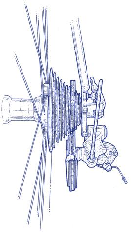 Otáčením šroubu horního omezení po směru hodinových ručiček posouváte vodítko s kladkami dovnitř, k ose kola, a proti směru hodinových ručiček zase ven. Nastavte pomocí tohoto šroubu polohu přehazovačky tak, aby horní kladka byla přímo pod nejmenším pastorkem, v jedné rovině s ním.