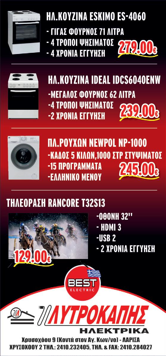 07 Τοπικά www.kosmoslarissa.gr ΠΑΡΑΣΚΕΥΗ 16 ΔΕΚΕΜΒΡΙΟΥ 2022 Ο ΚΟΣΜΟΣ ΤΗΣ ΜΙΚΡΟΣΥΣΚΕΥΗΣ ΕΙΝΑΙ ΣΕ ΕΜΑΣ Πλ.ρούχων ESKIMO ES5950 5 κιλα € 219 ΣΕΣΟΥΑΡ από 10€ ΤΟΣΤΙΕΡΕΣ από 12€ ΣΙ∆ΕΡΑ από 20€ ΣΚΟΥΠΕΣ από 35€ & Η ΜΕΓΑΛΥΤΕΡΗ ΠΟΙΚΙΛΙΑ ΜΙΚΡΟΣΥΣΚΕΥΩΝ ΣΕ ΕΜΑΣ ΣΤΙΣ ΧΑΜΗΛΟΤΕΡΕΣ ΤΙΜΕΣ Στην πληρωμή της πρώτης δόσης του πριμ πρώτης εγκατάστασης σε 418 νέους αγρότες της Θεσσαλίας, από την 3η Πρόσκληση του υπομέτρου 6.1 «Εγκατάσταση Νέων Γεωργών» του ΠΑΑ 2014–2020 κατά τη μεταβατική περίοδο 2021 και 2022, προχώρησε η Περιφέρεια Θεσσαλίας, καταβάλλοντας ποσό ύψους 10.769.500 ευρώ, που αφορά στην προκαταβολή 70% της συνολικής ενίσχυσης που θα λάβουν οι δικαιούχοι. Στους 418 νέους δικαιούχους περιλαμβάνονται οι εν δυνάμει