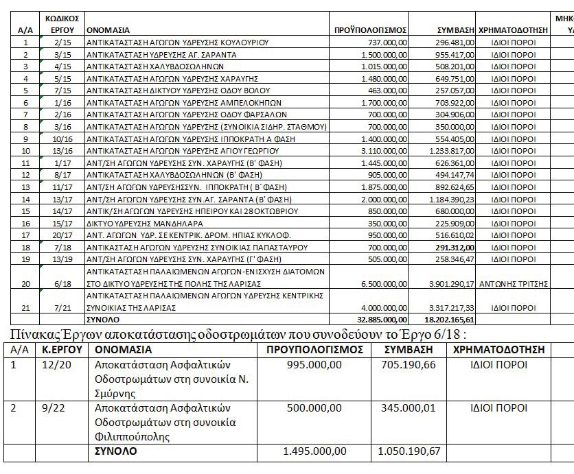 οι εργασίες κατασκευής του έργου 12/22 ΑΝΤΙΚΑΤΑΣΤΑΣΗ ΑΓΩΓΩΝ Υ∆ΡΕΥΣΗΣ Ο∆ΟΥ ΗΡΩΩΝ ΠΟΛΥΤΕΧΝΕΙΟΥ ΣΤΑ ΤΜΗΜΑΤΑ ΑΠΟ ΤΗΝ Ο∆Ο ΚΑΡ∆ΙΤΣΗΣ ΕΩΣ ΤΗΝ Ο∆Ο ΦΑΡΣΑΛΩΝ ΚΑΙ ΑΠΟ ΤΗΝ Ο∆Ο ΒΟΛΟΥ ΕΩΣ ΤΗΝ Ο∆Ο ΚΟΥΤΣΙΝΑ με προϋπ. 503.000,00 ευρώ για την αντικατάσταση 1.900μ. δικτύουΤαυτόχροναύδρευσης.έχει υποβληθεί