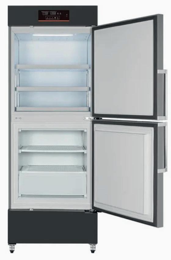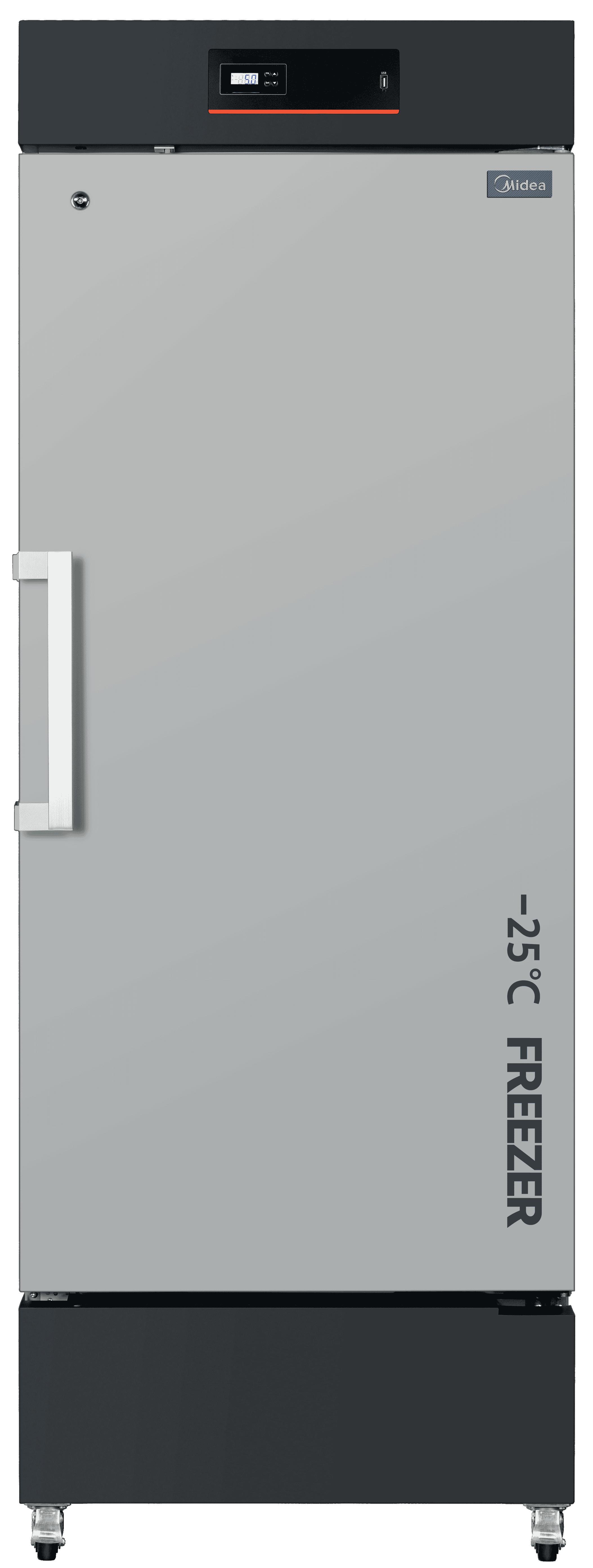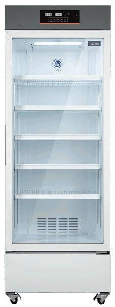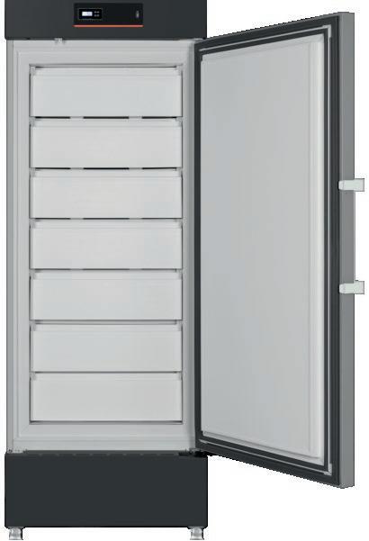 Control por microprocesador con enfriamiento por aire forzado. Pantalla LED con visualización de temperatura y humedad. Descongelamiento automático, batería de respaldo, puerto USB y alarmas.