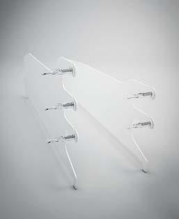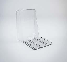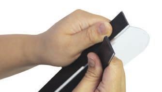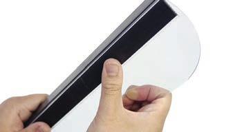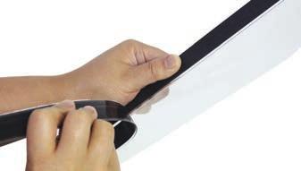 01 T-Style Hinged Sign Grip (pg 103) holds material in three thicknesses, 0.1”, 0.187” or 0.25” thick. Use with the Reusable Foam Tape Fastener (pg 165).