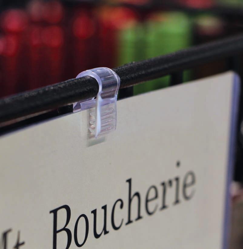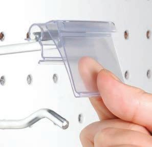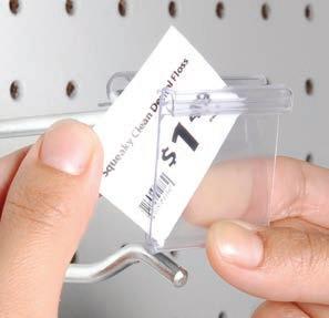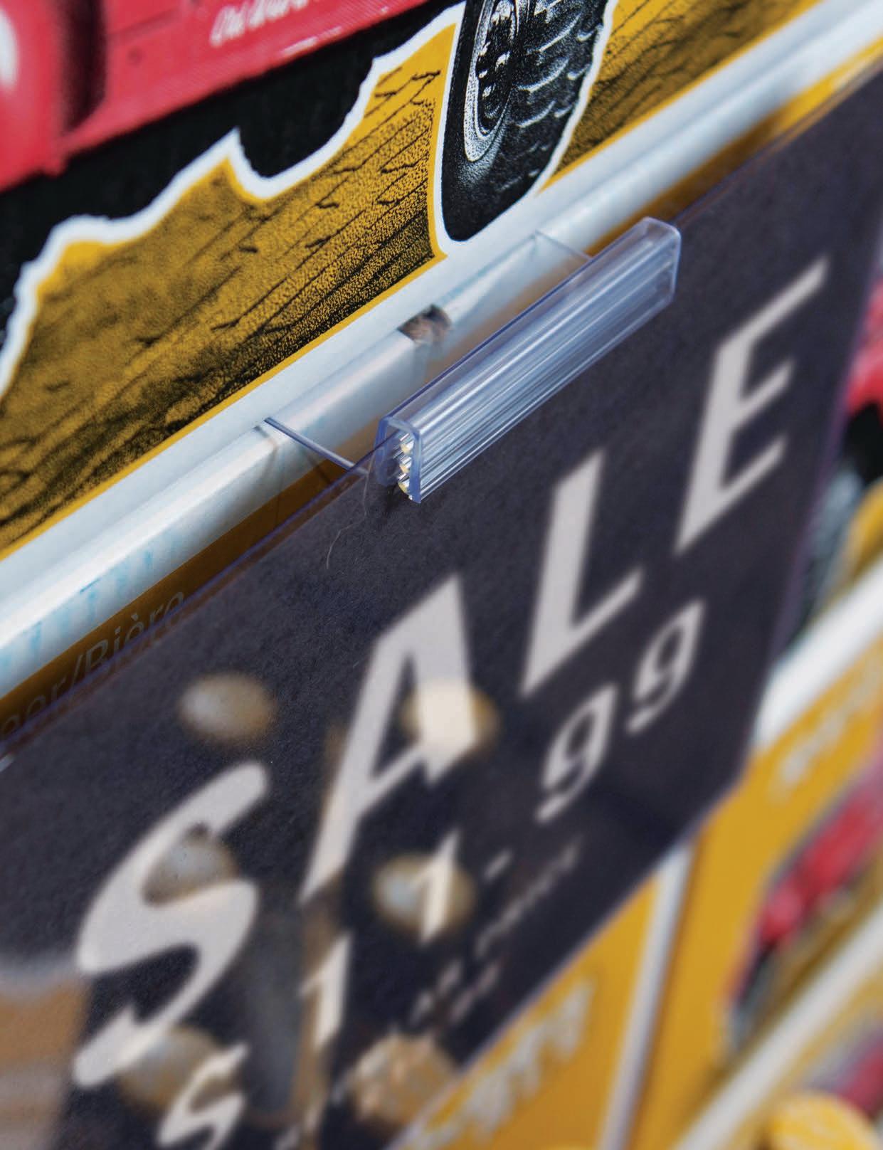 01 ClearVision® 1”H Double Wire, Clip-Over Hinged Ticket Molding (pg 42) can be quickly installed, clips onto 0.875’’ to 1’’H double wire shelving. It is ideal for displaying price and promotional information on cooler or freezer shelves. It has a flexible, clear window. Pair this with our ClearVision® ShelfTalkers (pg 80 – 82) to call out products with special messaging.