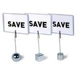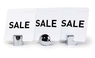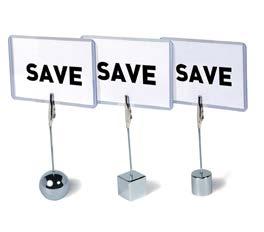02 PowerGrip® Three Grip, Edge Stem, Adjustable Sign Holder (pg 118) displays signs back to back, in up and down positions. With the powder coated aluminum, the sign holder blends in with your displays.