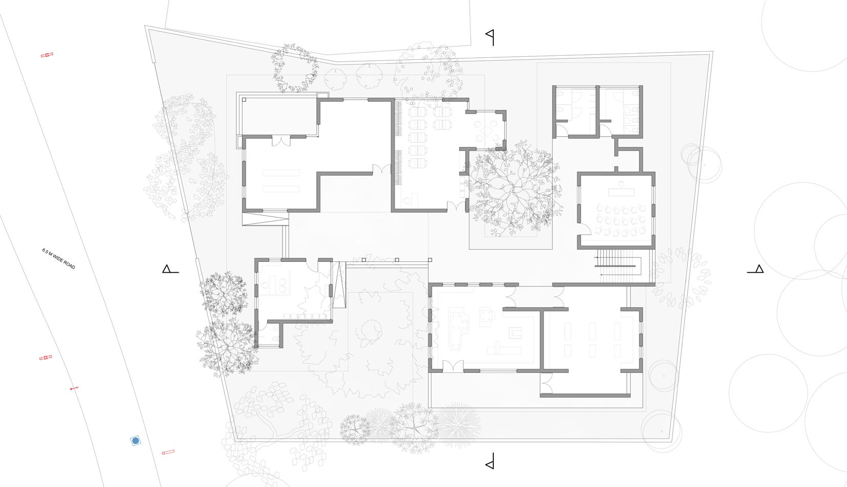 There are a lot of trees on the site so a way around was to make them a part of the design and not just as landscaping. The site is covered with plinth with green pockets and stairs for level differences. Each pocket gives a different space and experience.