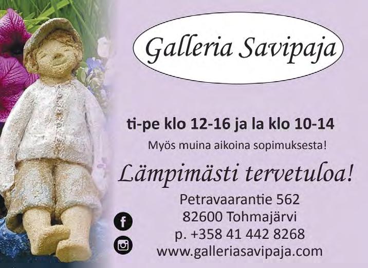 turvalliseksi ja mukavaksi matkanteoksi. Suunniteltu, testattu ja viimeistelty juuri sinun mielenrauhaasi varten vuodesta 1932. nokianrenkaat.fi 47 Peltotie 4, KITEE 013 411 188, ma–pe 8–17 Ainutlaatuisten Nokian Tyres Hakka® -kesärenkaiden uudistunut kolmas sukupolvi muuntaa karkeat tiet ja laajat lämpötilavaihtelut turvalliseksi ja mukavaksi matkanteoksi. Suunniteltu, testattu ja viimeistelty juuri sinun mielenrauhaasi varten vuodesta 1932. NOKIAN TYRES HAKKA® BLACK 3 NOKIAN TYRES HAKKA® BLUE 3 NOKIAN TYRES HAKKA® GREEN 3 UUSI RENGAS VELOITUKSETTA Avoinna 1.–29.7.2023 Onnen maa Ohjaus Ninnu Karttunen Tohmajärven teatteri esittää Markku Pölösen ENSI-ILTA LA 1.7.2023 klo 16 TI 4.7 klo 19 SU 9.7 klo 14 TI 11.7 klo 19 TO 13.7 klo 19 LA 22.7 klo 14 TI 25.7 klo 19 TO 27.7 klo 19 SU 30.7 klo 14 TI 1.8 klo 19 LA 5.8 klo 14 SU 6.8 klo 19 Liput 15€ Mukana Tangoyhtye Hurma! Maiju Lassila -teatteri Kirkkotie 14, Tohmajärvi www.tohmajarventeatteri.fi tohmajarventeatteri@gmail.com KARHUFESTIVAALI