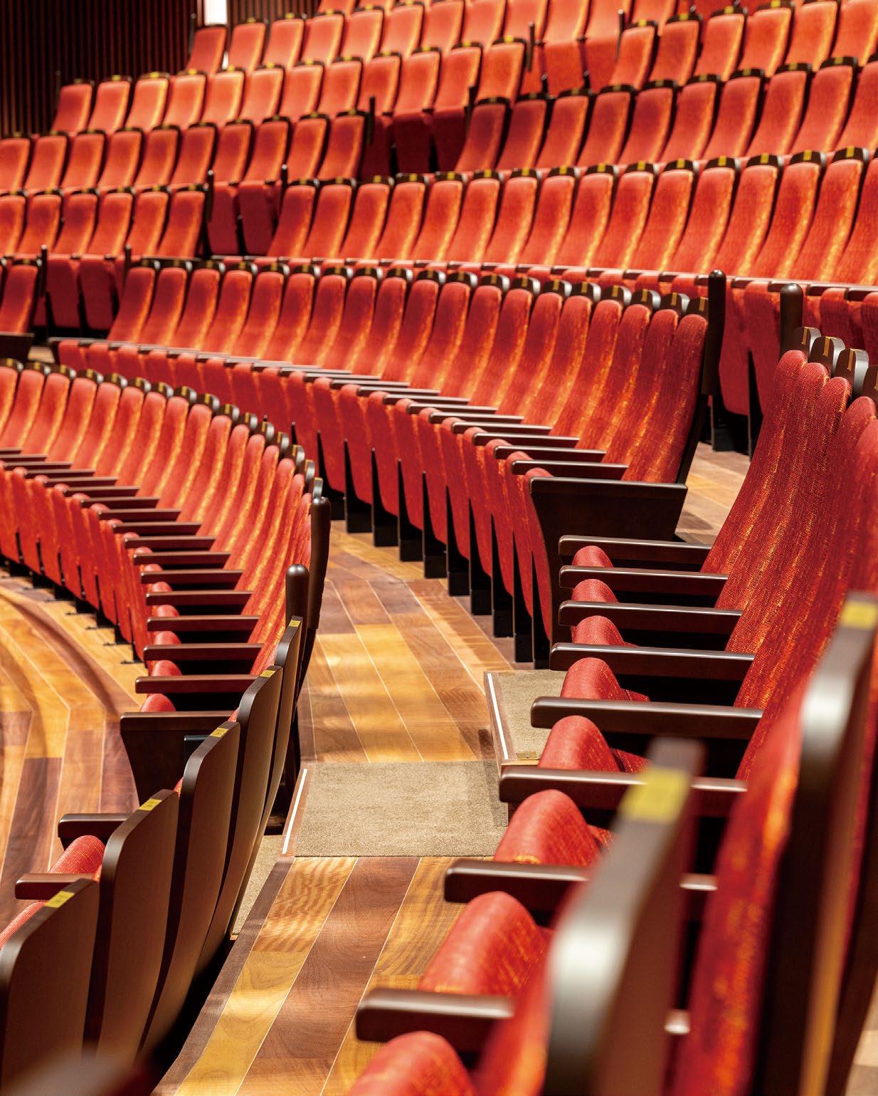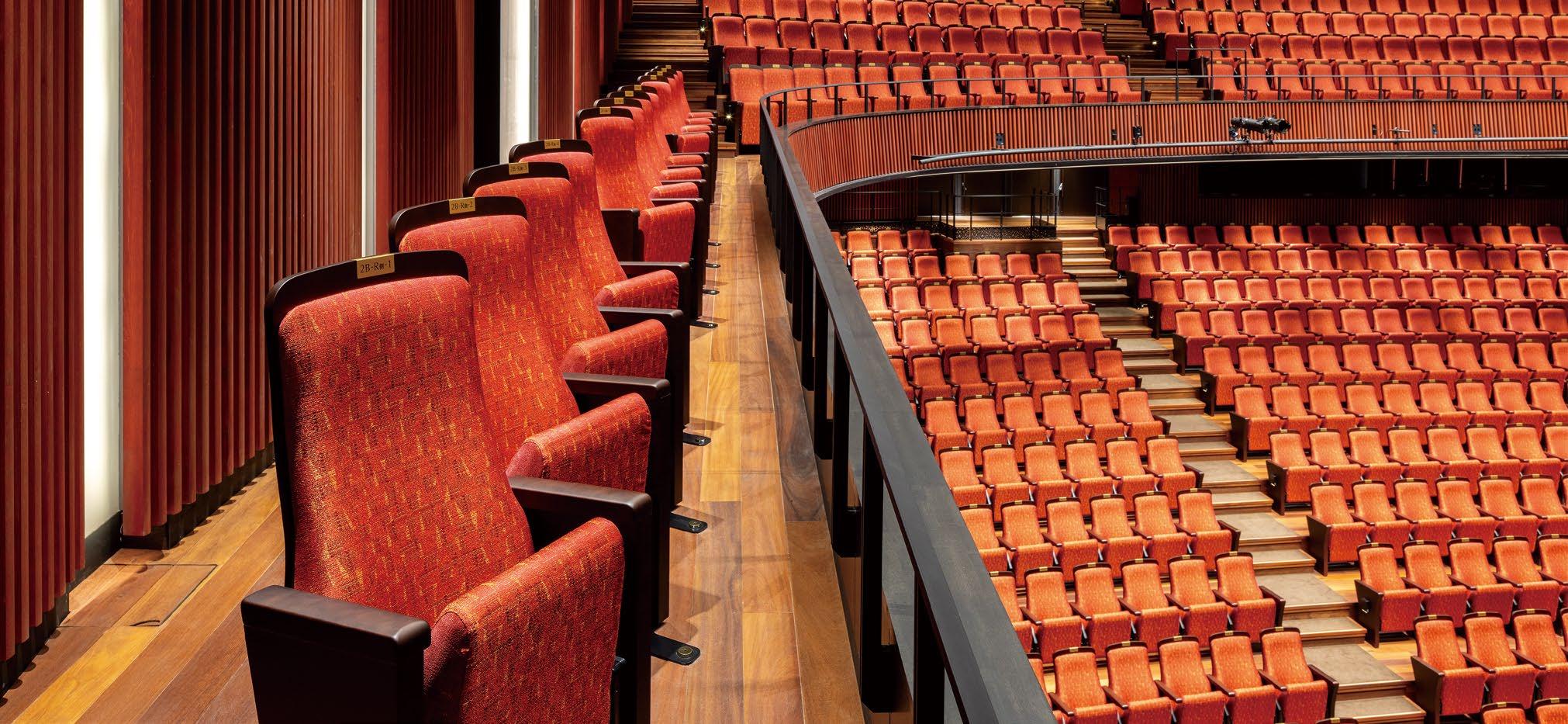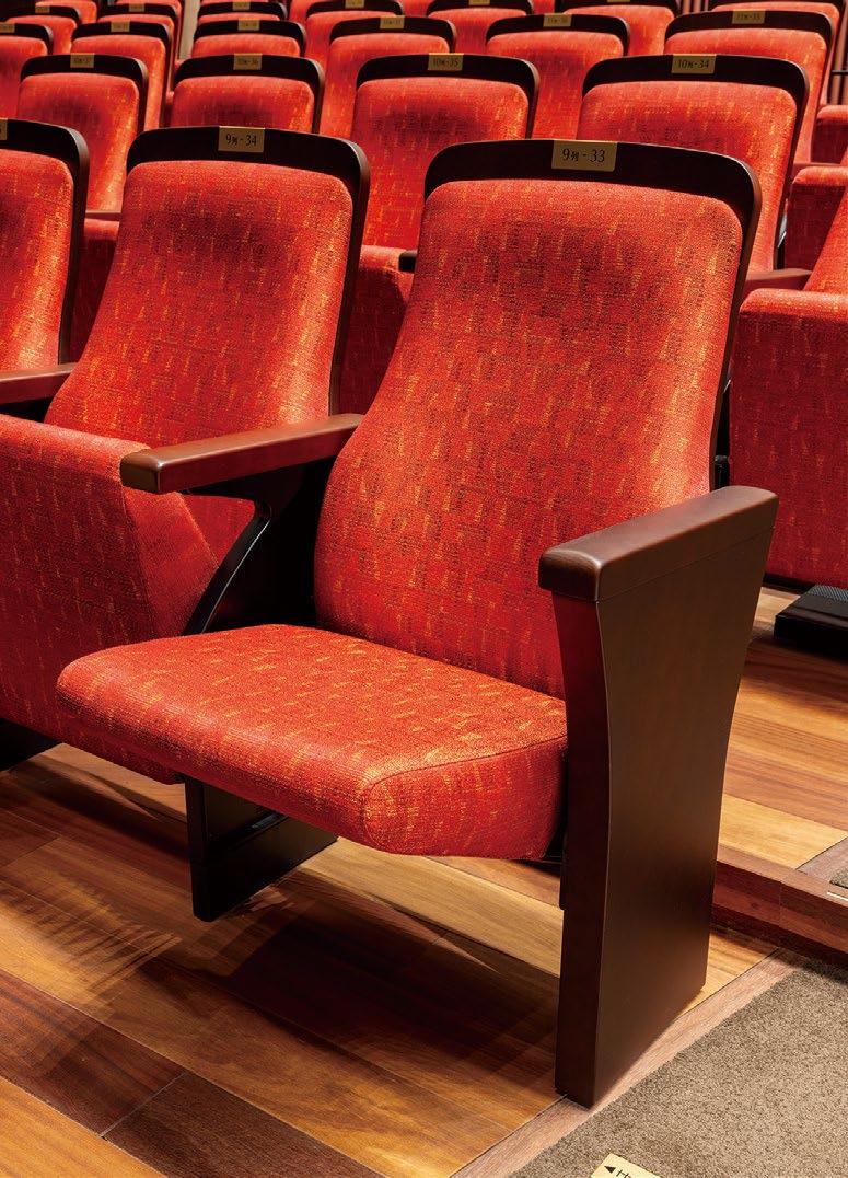Seating is lined up straight toward the stage and arranged based on Unizon, as in the Grand Theatre. The backboard and cushions have a linear trim in contrast to the Grand Theatre. The cushions were designed to show a solid wood edge when viewed from the front. Combined with the sharp lines that shape each seat, this gives the