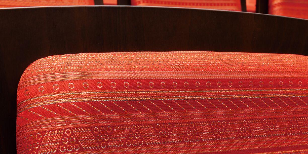 The seat upholstery in the hall of the Ibusuki Citizen Hall was designed by our group company, FABRIKO Co., Ltd. based on a request from Ibusuki City. After multiple meetings with Ibusuki City, we proposed several ideas based on their opinions and requests on three themes such as Ibusuki Cityʼs flower, butterfly, Kaimondake and Narikawa-style earthenware. The upholstery has a vermilion base with the geometric stripes based on the earthenware patterns woven with colorful and shiny threads. This means the impression given off changes depending on the angle at which they are seen and how the lighting hits them. This gives the entire audience seating a rich range of appearances. The colors used in the city emblem are woven into these shiny weft threads. This produces a design which is truly distinctive of Ibusuki City with attention to detail.