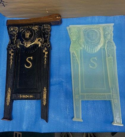 1 Meeting with foundry 2 Existing piece with damaged front leg base (left), and a model created from the existing piece using a 3D printer (right) 3 Sand casting 4 A historical wooden mold from the foundry 5 A prototype modeled using a 3D printer, with coloring and bracket arm attached