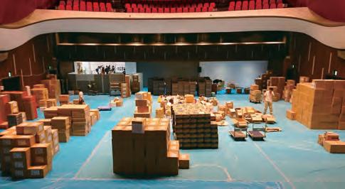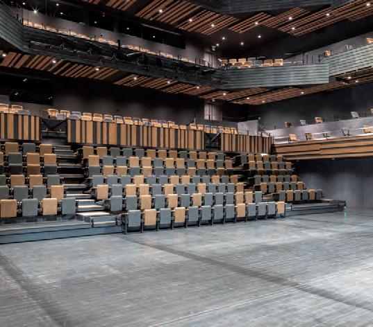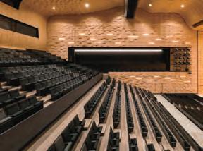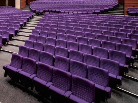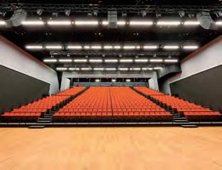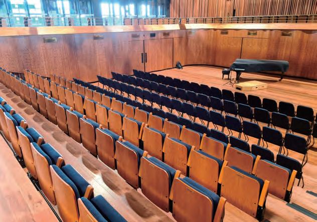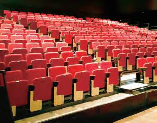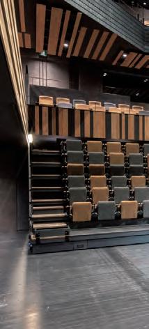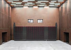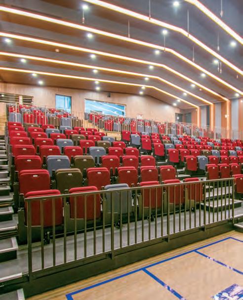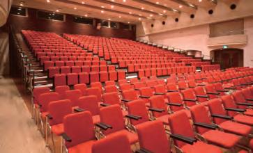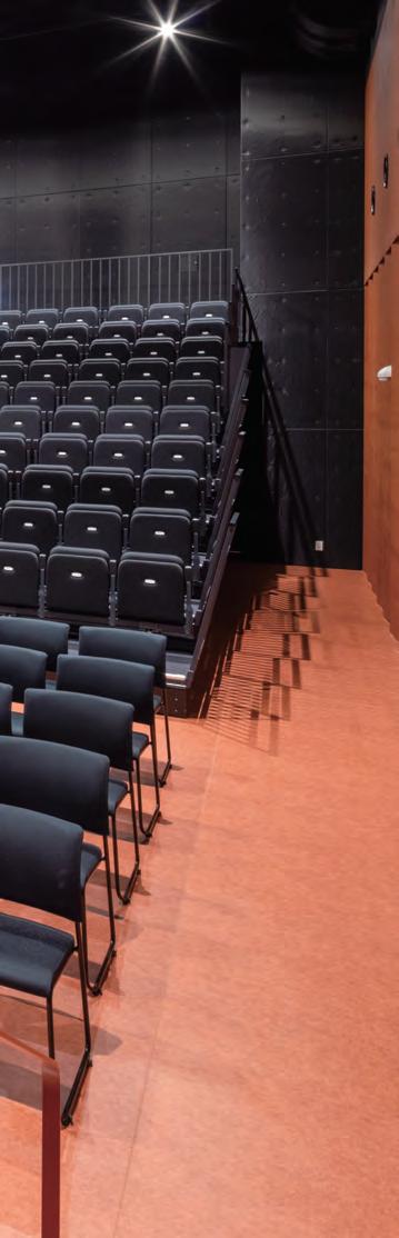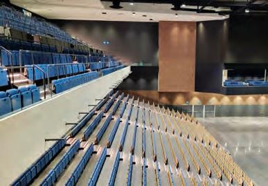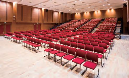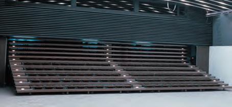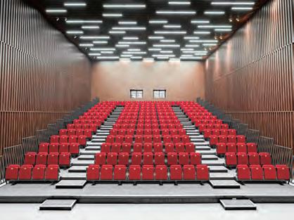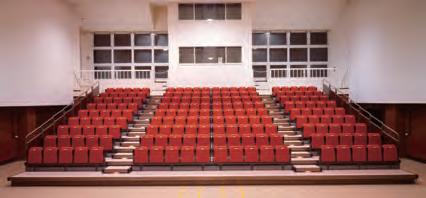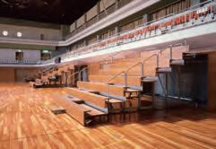 matching stacking chairs. The retractable seating system is semi-automatic, with manual operation for lifting and tipping the chairs and electric operation for deploying and retracting the main unit. After the seats are folded down using the dedicated handles, pressing a remote button causes the 10-tier retractable seating system to collapse and retract into a special compartment built into the wall at the rear of the hall.