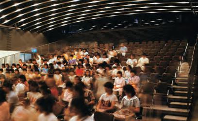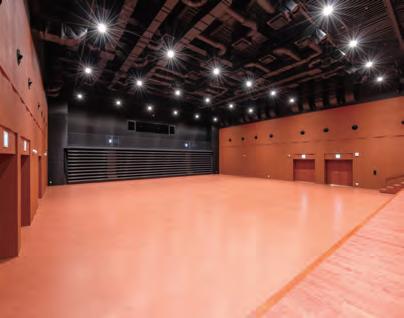 The multi-purpose hall located in the civic hall building can accommodate 624 people in theater style seating and 750 people in flat-floor style seating. The decision to install a movable seating system was based on the assumption that the hall would be used as a disaster response base for the Self-Defense Forces, police, and fire department in the event of an emergency situation requiring a large open space.