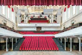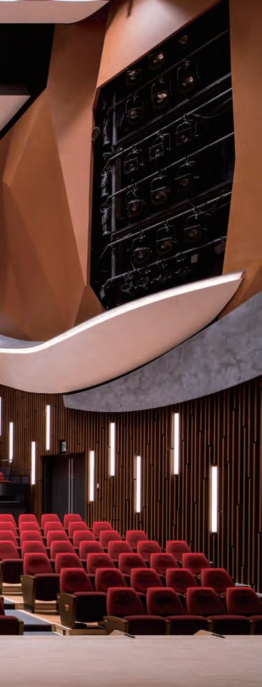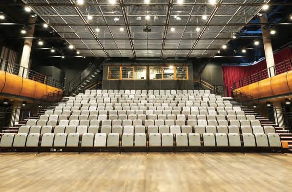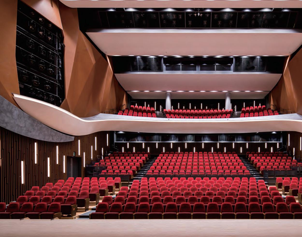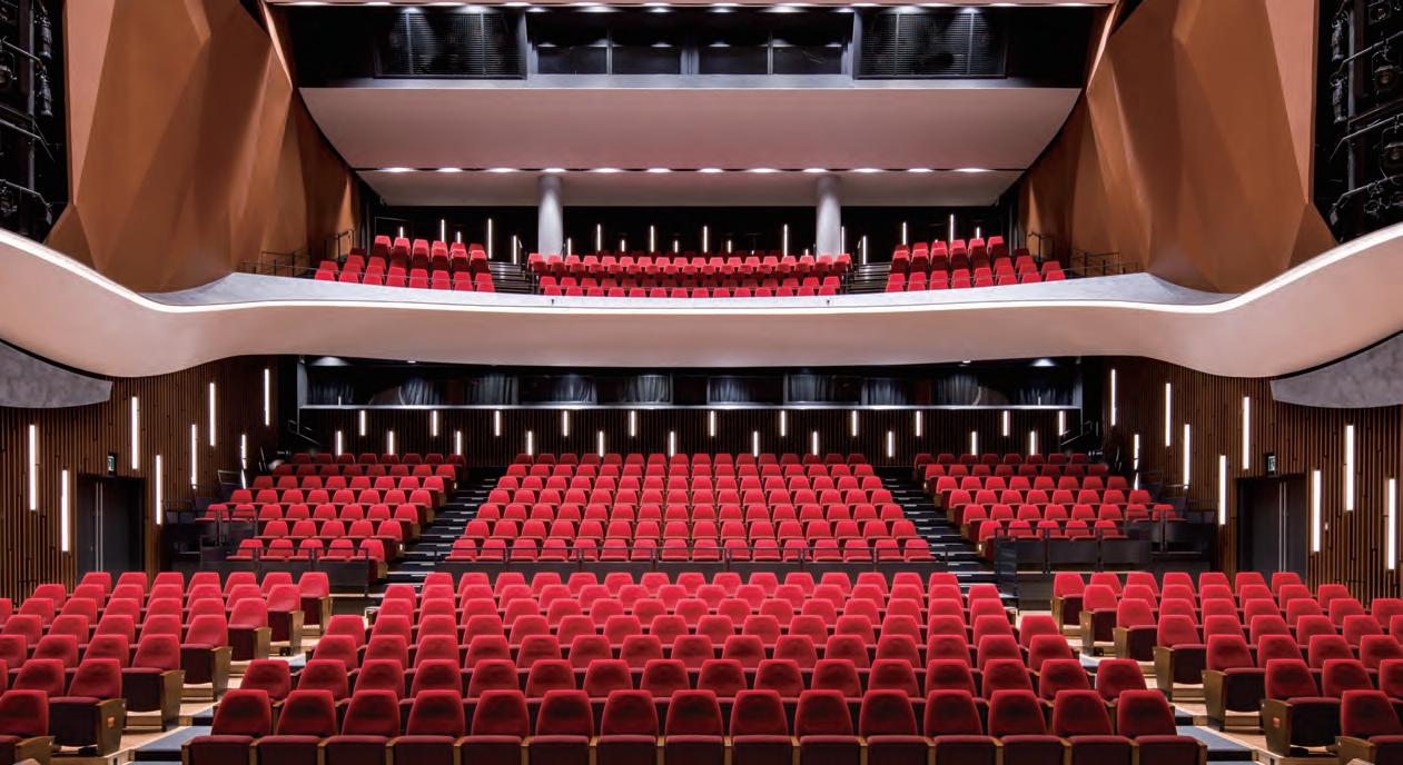 The hall features a bright interior in traditional deep red, and is furnished with 280 chic black retractable seats and 160