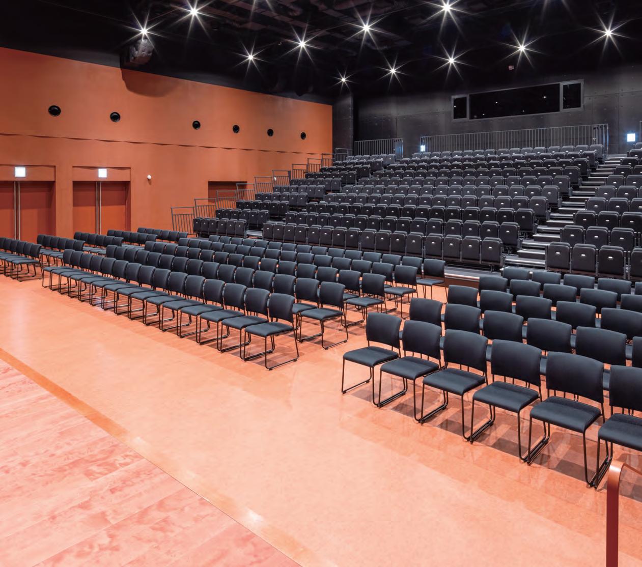 280 chic black retractable seats and 160 matching stacking chairs. The number and layout of seats can be adjusted according to the event.
