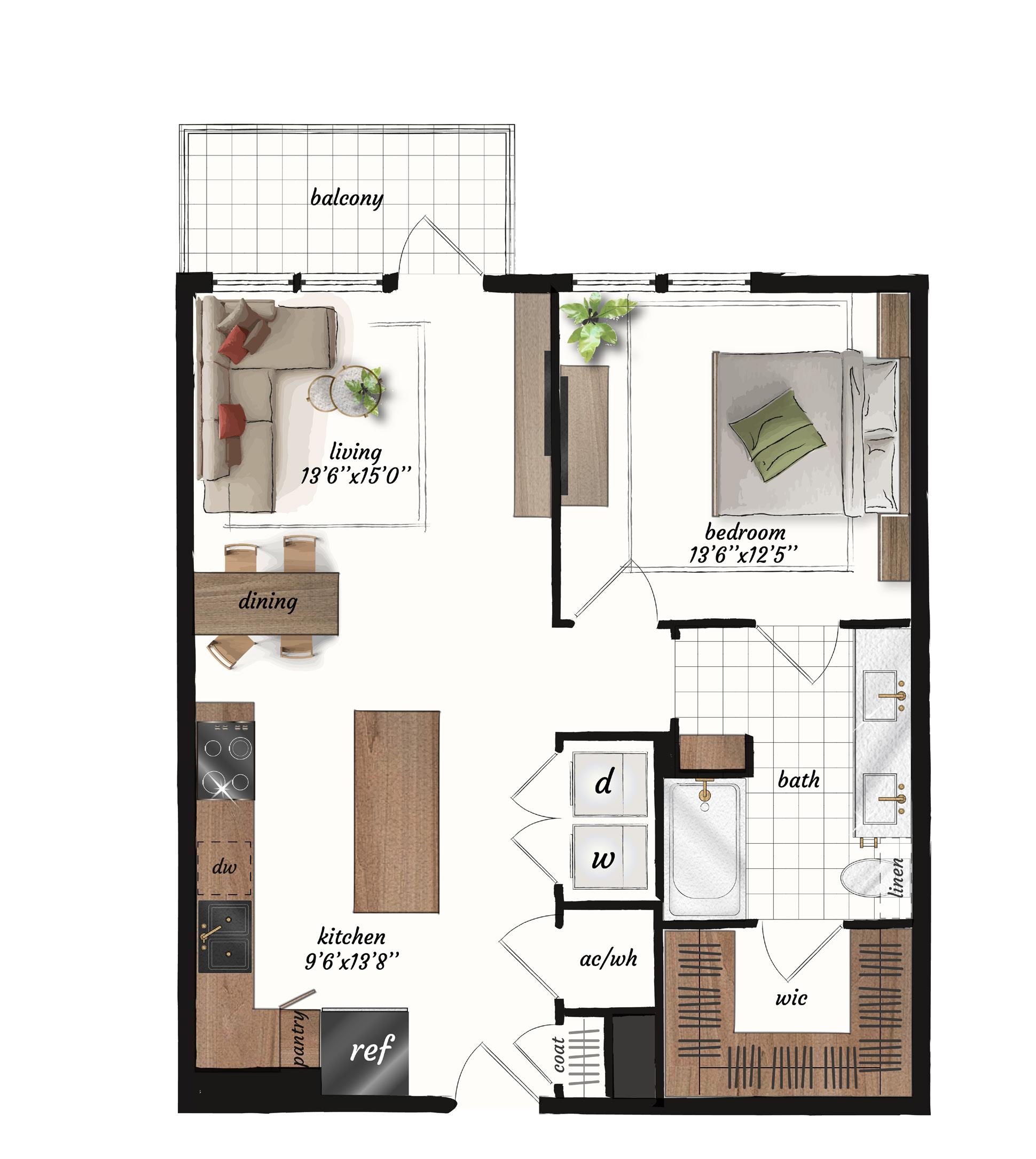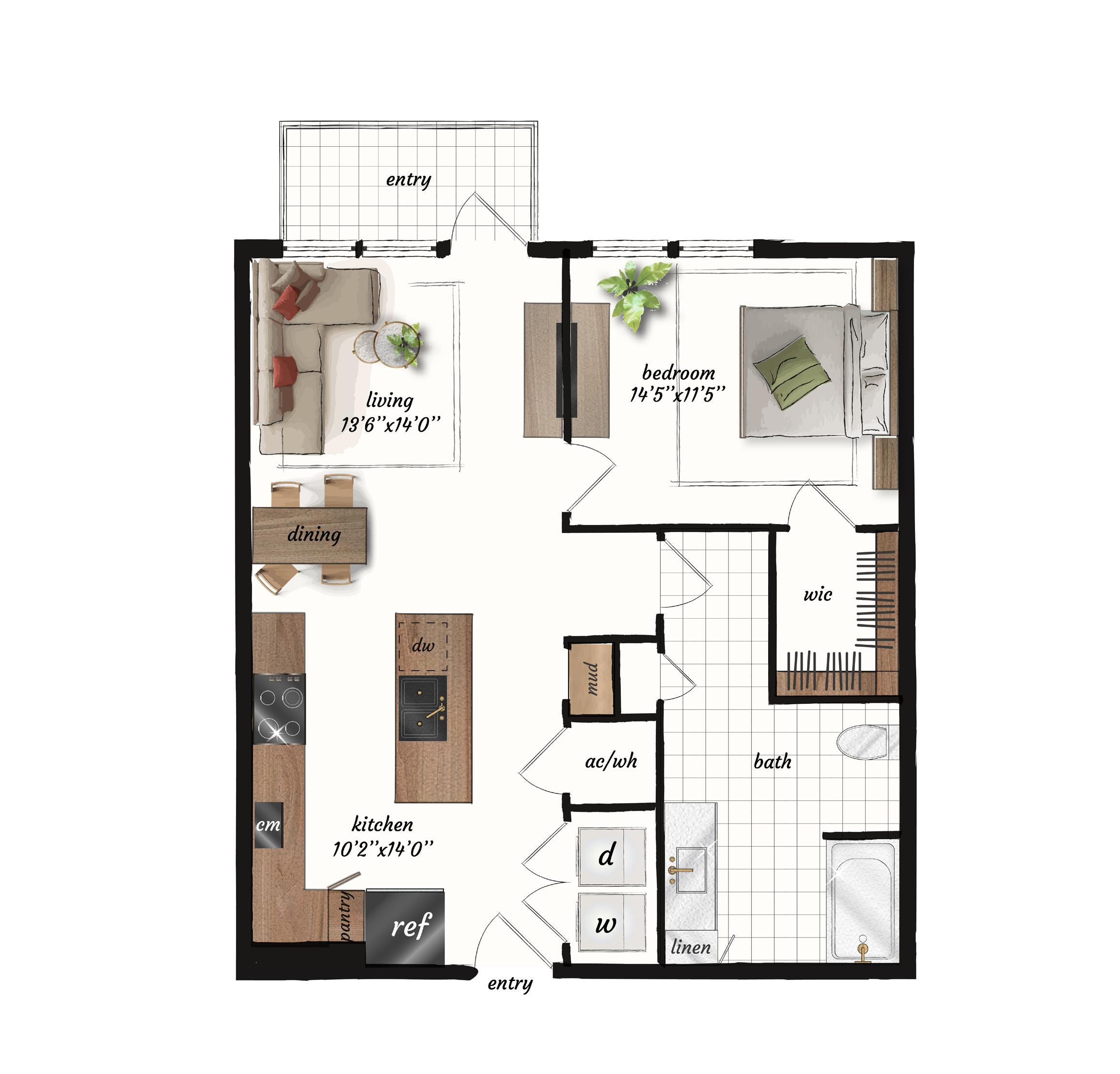 dw kitchen bath bedroom wic w d linen ac/wh entry entry living ref cm 12’2’’x11’6’’ 10’3’’x11’10’’ 10’0’’x14’1’’ UNIT A2-LW A2.LW 690 SQ. FT. 1 BEDROOM 1 BATHROOM Level 1