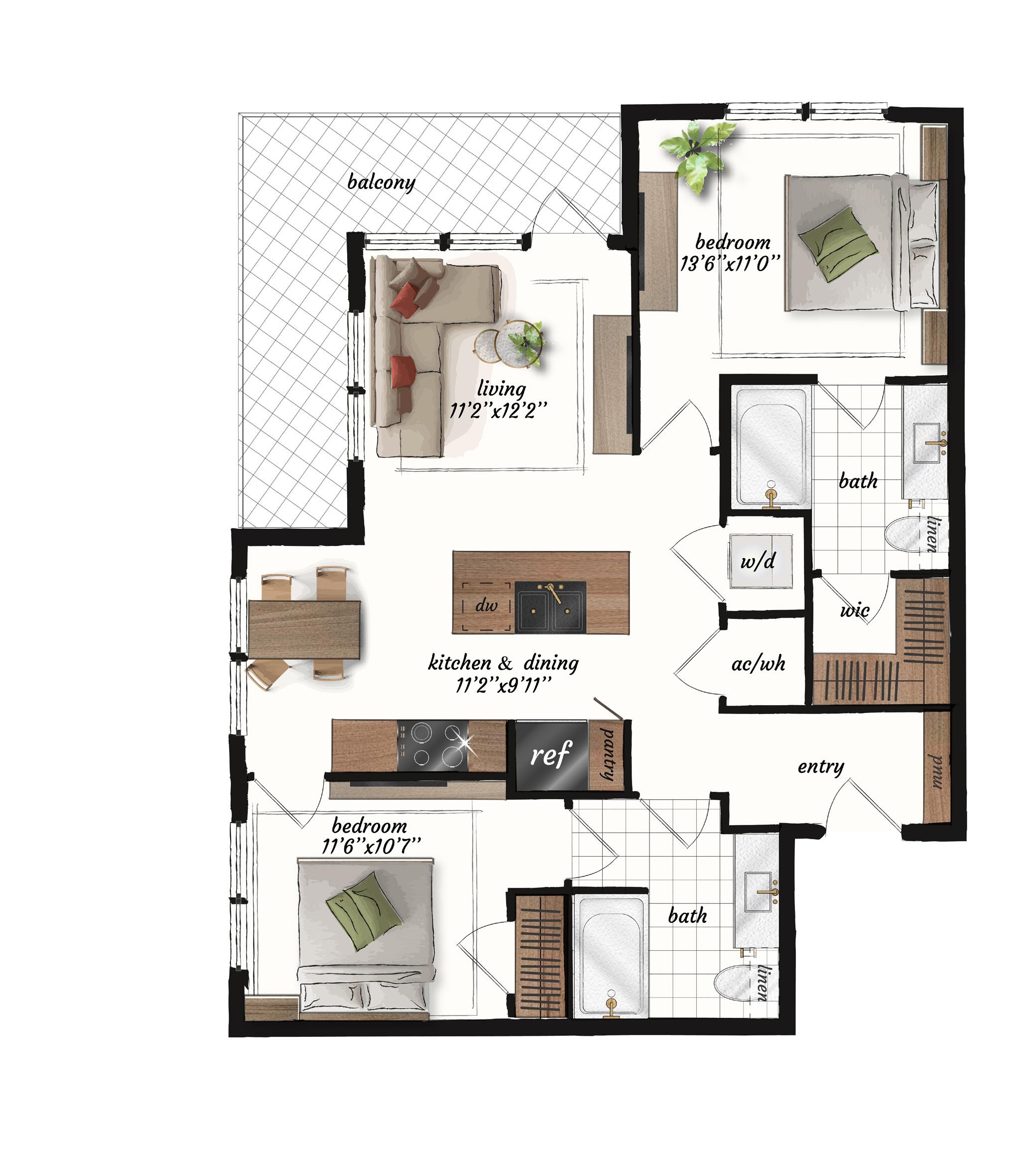 dw linen kitchen bath bedroom wic w d ac/wh balcony living ref cm UNIT A2 ANSI A 12’2’’x11’6’ 10’3’’x11’10’ 7’1’’x14’7’ Floor plans are artist's renderings. All dimensions are approximate. Actual product and specifications may vary in dimension or detail. Not all features are available in every apartment. Prices and availability are subject to change. A2 ANSI A 690 SQ. FT. 1 BEDROOM 1 BATHROOM Levels 1 - 3 Levels 2 - 3