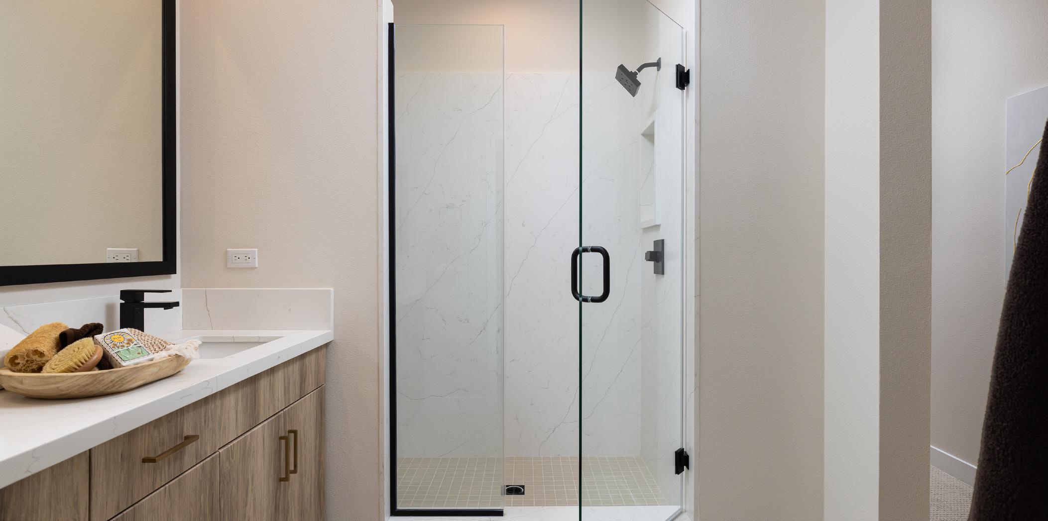 • Primary Shower includes tiled walls and shower enclosure with 3/8” clear tempered glass, soap niche and seat (per plan)