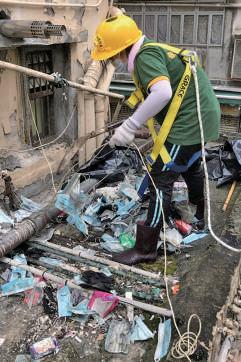 20 餘人冒著風雨來到九龍大角咀萬安街後巷 , 針對前期探 查的衛生黑點進行清潔,齊心協力掃除紙皮等雜物,清洗消 毒後巷道路,以一個潔淨的社區共迎國慶。