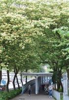除了太子和九龍城,另一熱門賞花 地是旺角至大角咀的行人天橋。這裏種 植了多棵樹木參天的魚木樹 , 相互交 織,好似一幅白色、黃色巨型的簷蓬, 將天橋重重包圍。置身連接大角咀櫻桃 街至旺角亞皆老街的行人天橋上,如進 入時光隧道,拍出被花海重重包圍的美 景之餘,還充滿宮崎駿電影《借東西的 小矮人亞莉亞蒂》的夢幻感覺!