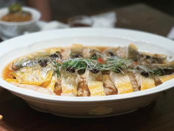 蘿蔔醬蒸黃魚肉燕製作需時 近期多次北上珠海山姆 「 掃貨 」 的陳太 , 對商場內的美食指數 瞭如指掌 , 極力推薦這家走新派路線的福建小館 。 對 《 龍週 》 記者 這位老福建來說 , 雖然菜單上不全是傳統的閩南菜 , 但樣樣都非常 美味和開胃 , 如炎夏吃一道由檸檬汁和香料烹調的冰鎮鮑魚 , 認真 過癮 , 欲罷不能 ; 十年老蘿蔔醬蒸黃魚肉燕 , 製作需 時,底層瘦肉,上層黃魚,味道鮮味,送飯一流。還有 值得一試,粒粒飯都晶瑩通透的蔥頭油火腿紫菜焗飯。 至於其他菜式,才次再試!