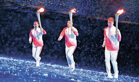 ▲火炬手蘇炳添(中)、張家朗(右)、李禕在開 幕式現場跑向主火炬