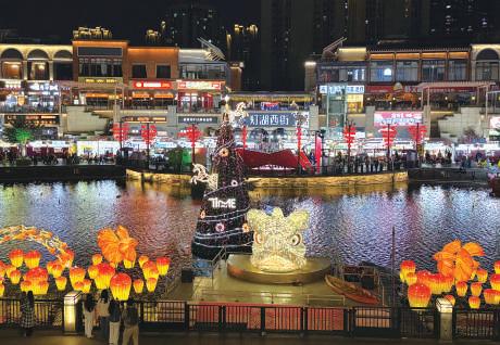 ◀ 千燈湖公園華燈初上燈 火璀璨,美食雲集