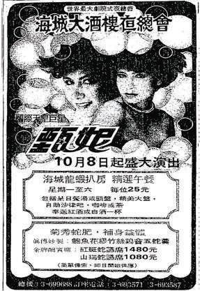 羅文是海城的演出常客 , 一年可以在海城唱百多場 ; 徐小鳳則 是海城的頭號巨星 , 身價也是最高 , 而且必定在新年檔期演唱 , 《 喜氣洋洋 》 更是全晚氣氛最高漲的歌曲 , 她曾在海城連開四十二 場 , 叫好又叫座 。 另一方面 , 八十年代很多大公司的春茗 、 尾牙 、 聖誕聯歡 、 周年誌慶等活動 , 都選擇以海城為主場 。 無線電視的台 慶職藝員聯歡晚宴 、 九龍巴士公司等大機構的周年晚宴 , 當年曾一 連兩天在海城擺酒,非常熱鬧。