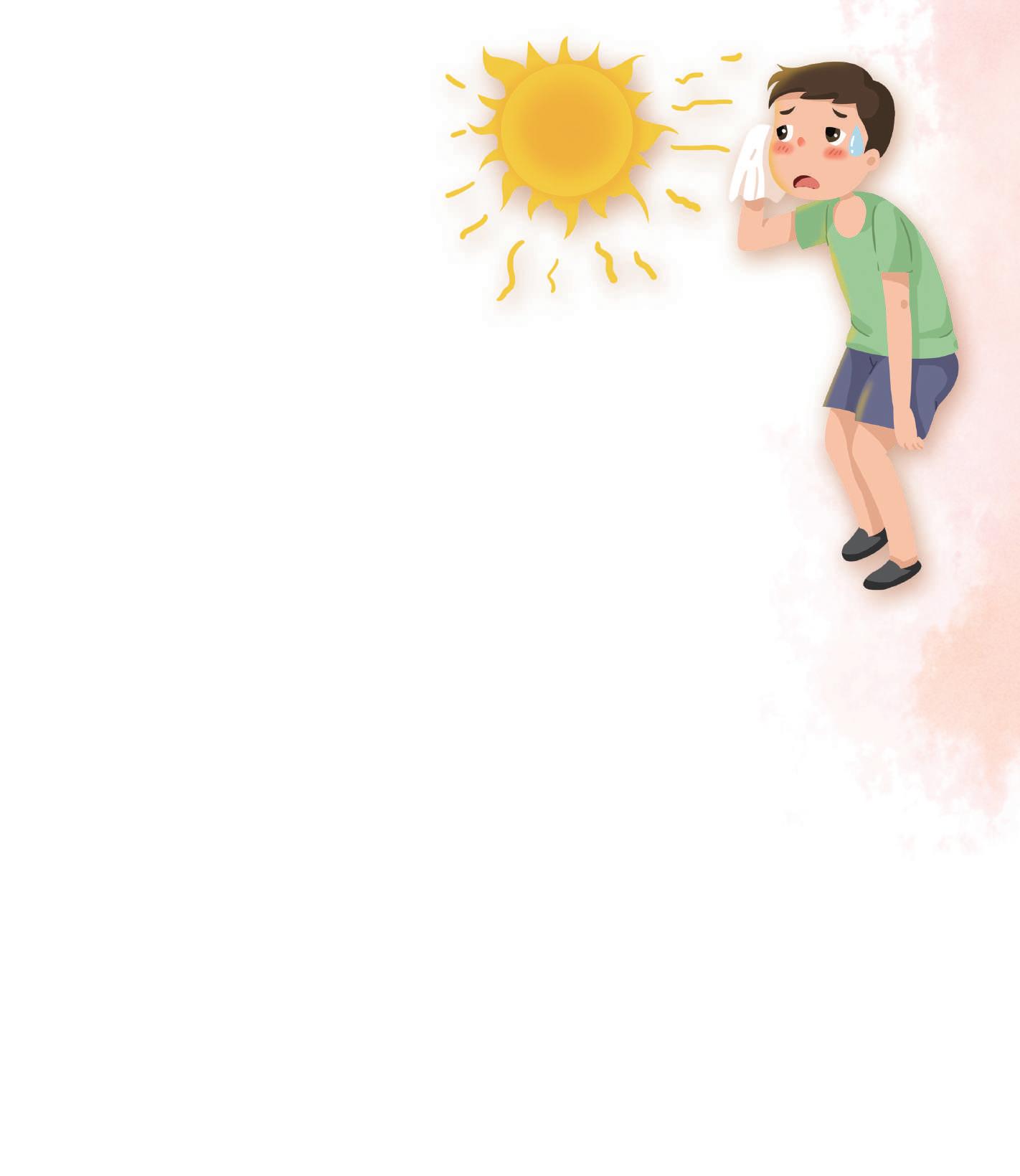 在戶外活動時,應盡量避免在中午時份進行劇烈運動或長時 間逗留。必須外出時,應穿著淺色、透氣的衣物,並佩戴闊邊帽 和太陽眼鏡 , 同時塗抹防曬系數 (SPF) 30 或以上的防曬產品 。 補充水分至關重要,即使不感口渴,也應定時喝水。