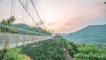 在鬱鬱蔥蔥的山谷中,肇慶首座玻璃橋橫空出世,它採用最先進的5D 聲光特效 , 長 300 米 、 寬 2 米 、 垂直落差 200 米 , 也是粵西地區首座全透明 高空玻璃橋 。 行走其間 , 腳下溪流與嶙峋奇石清晰可見 , 予人動魄驚心的 震撼。