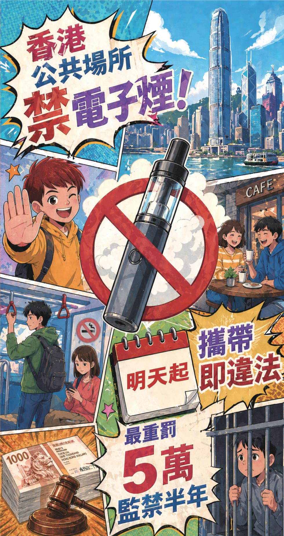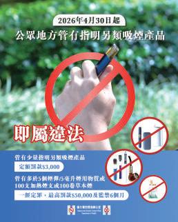 近年政府不斷加強控煙力度,最新政策是由明天(4 月 30 日) 起 , 任何人不得在公眾地方管有指名另類吸煙產品 , 包括電子煙煙彈 、 煙油 、 加熱煙支及草本煙