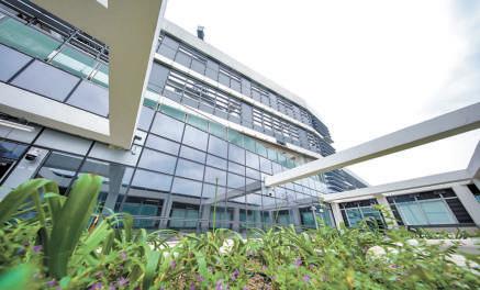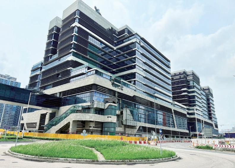 ▼ 啟 德醫院將於 2026年 10月 開始分階段投入服務 。 圖為 腫瘤科大樓 , 後方為專科門 診大樓。(政府新聞處)