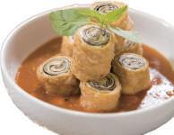 岩鹽1/2茶匙、黑胡椒碎適量 做 法 1 將1張鮮腐皮攤開,在向上的一面平均灑上少許岩鹽及黑胡椒碎,然後 再放上一張紫菜及一張鮮腐皮,將腐皮緊緊的卷好,用麵糊封口,備用。 2 在平底鑊中下油,放入腐皮卷用中慢火半煎炸至四面呈金黃色,備用。 3 熱鍋下油,先下蕃茄炒至半溶狀態,再下蕃茄醬及適量水拌勻及煮 沸。 4 略煮一會後加入鹽糖調味,最後加入少許生粉水至濃稠,再拌入金不 換碎及橄欖油成醬汁,放入容器中。 5 將腐皮卷平均切開六件,再放上醬汁上,趁熱享用。