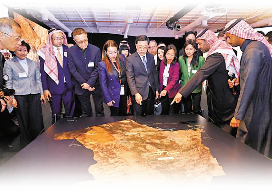 ▲ 李家超與代表團參觀一個 有關沙特 「 未來城市 」 的展 覽 , 了解當地發展智慧城市 的計劃