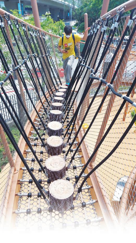 志健表示,園景平台以「好玩自然」為設計概念,設五個以不同自然元 素為主題的遊樂區,提供15個不同遊樂體驗,合共超過60組遊樂設施, 適合不同年齡人士使用 , 例如高達 8 米的繩網攀爬架 , 以及供輪椅人士 一同玩樂的「氹氹轉」。