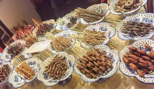 東門町美食街出名美食多多,一條街開 滿林林總總的小食檔,包括冒煙冰淇淋、鉢 仔糕、酸奶撈、魷魚烤串、烤肉串、肥腸包 大葱、糯米飯、粉絲扇貝、雞翅包飯、新疆 烤包子、醬豬蹄、醬骨架、卷涼皮、撈汁海 鮮、五花肉包泡菜、肚包肉、蚵仔煎、泡菜 煎豆腐、台式飲品、麻辣燙等,難怪不少內 地網紅稱之為「吃貨們的天堂」。