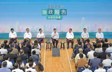 ▼李家超(中)與部分主要官 員出席2024年《施政報告》地 區諮詢會